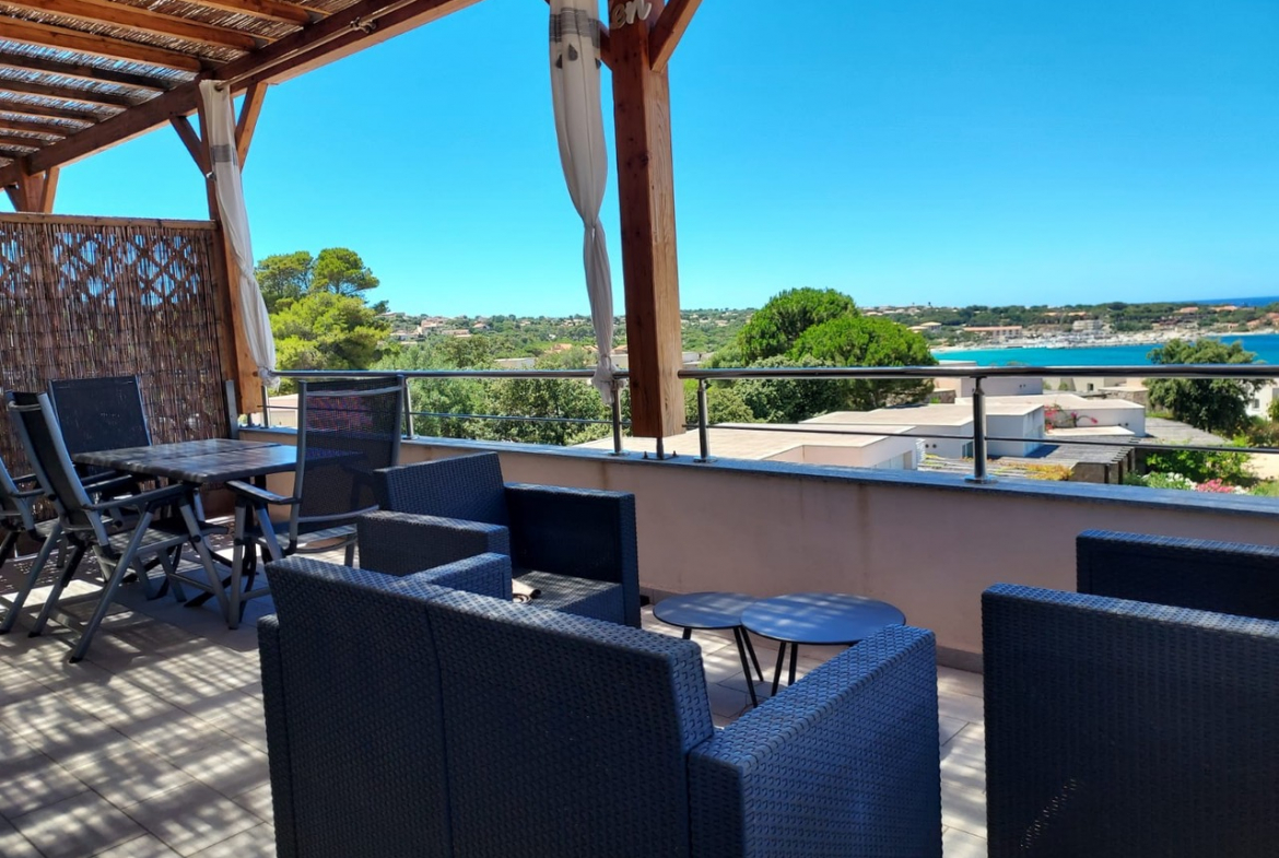 Grande terrasse de 21 m2 avec magnifique vue à 180° sur la mer et la baie de Marine de Sant’Ambroggio.