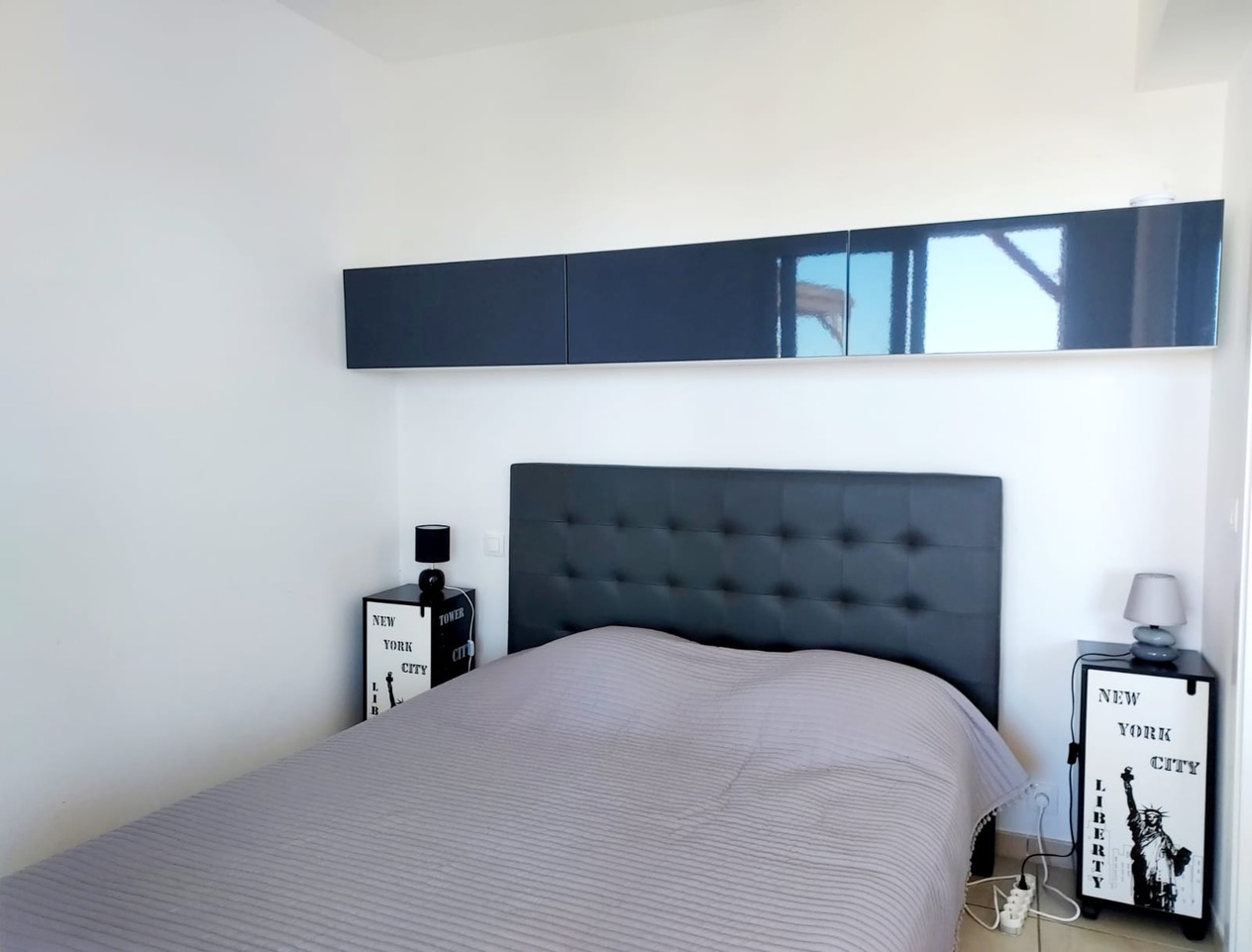 • Une chambre pouvant accueillir un lit double en 160 cm, tiroirs de rangement, petits placards, fenêtre avec rideaux occultants et moustiquaire